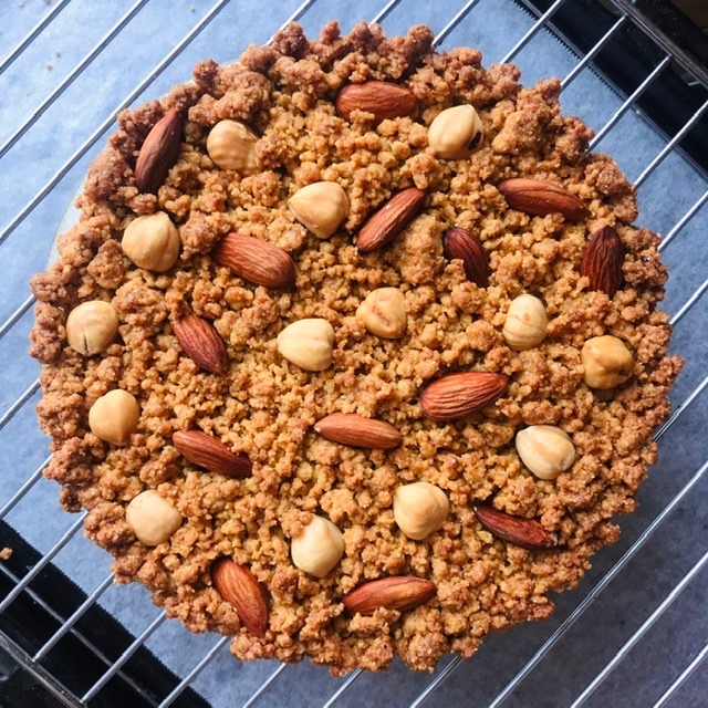 石臼挽きコーンミールとレモンの香りのクランブルタルト。ナッツ好きにはたまらない一品。焼いてからも熟成します。(お土産としてお持ち帰り・1400円相当)